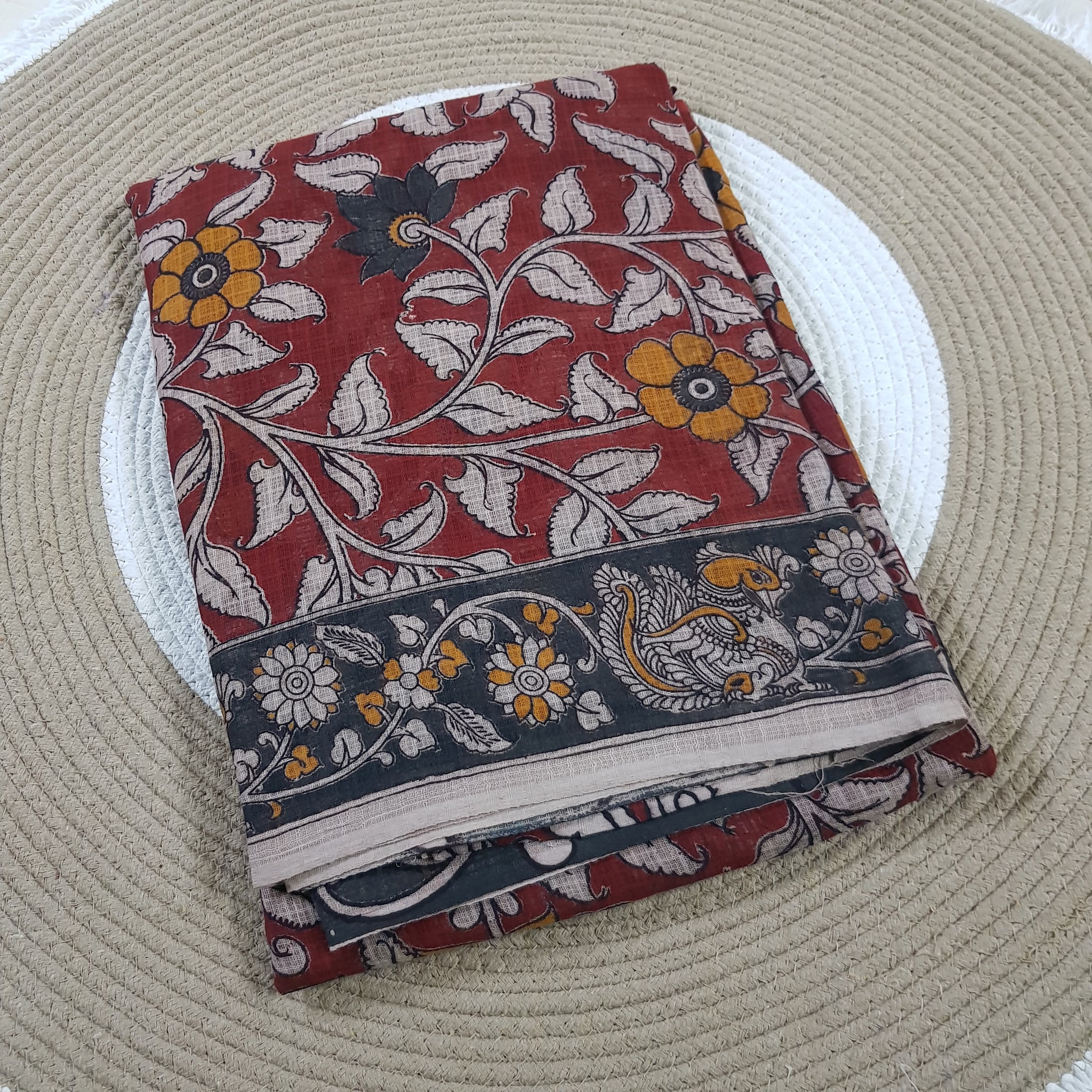 🧵 Blouse: Includes a contrast Kalamkari design as the running blouse piece.