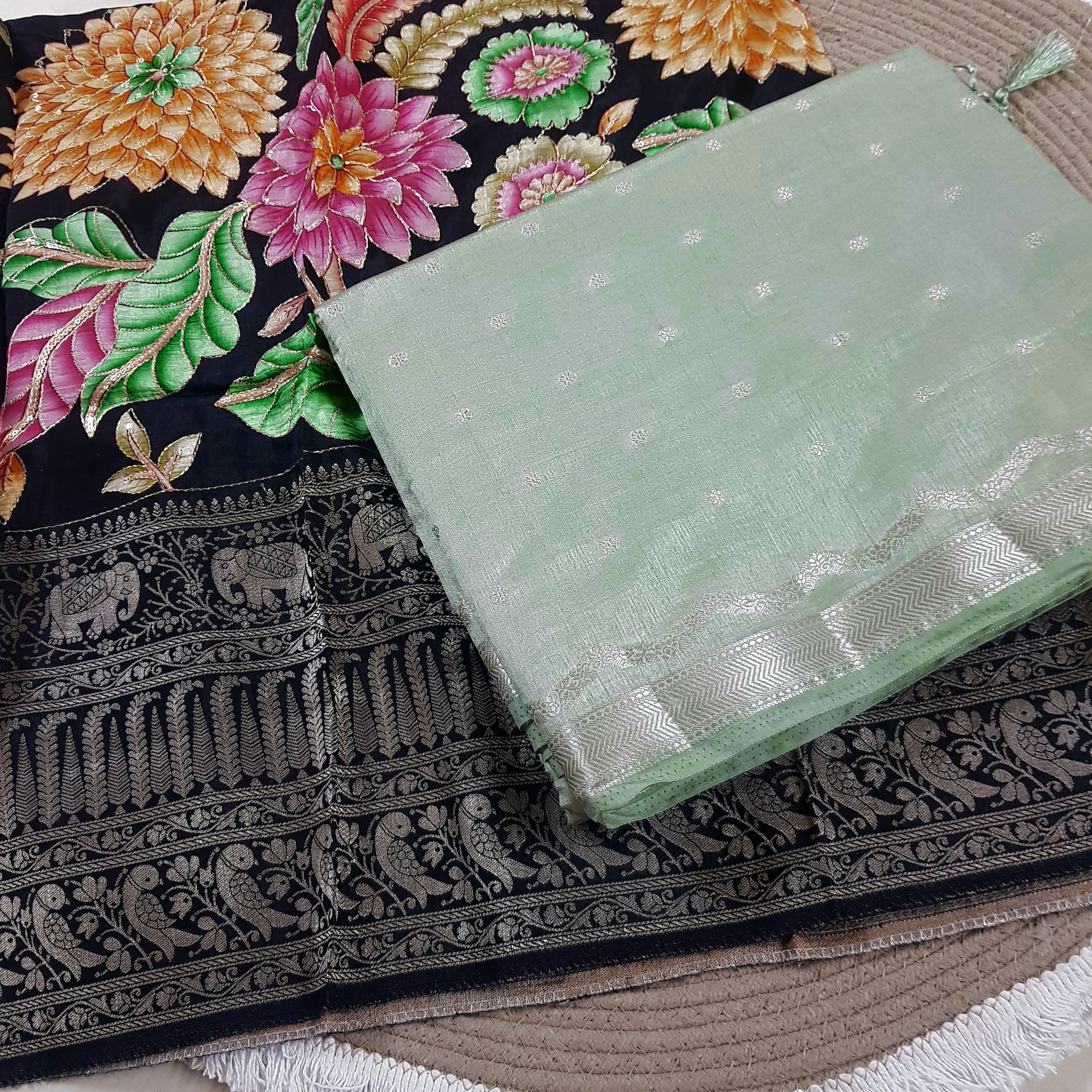 Saree Color - Pista Green / Blouse Color - Black base with multi-color Flower design adorned with zari thread emboridery and sequence work.